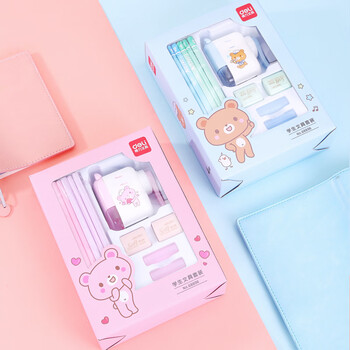 得力萌咿系列学生文具套装生日礼物/六一儿童节礼盒开学礼物1-2年级铅笔+卷笔刀+橡皮+握笔器17件套 蓝色 68896