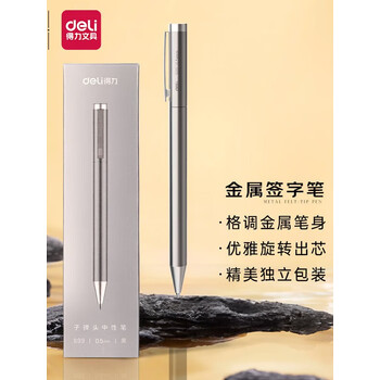 • 商品名称:得力(deli)S99金属旋转中性笔0.5mm黑色签字笔礼盒装 单支装 皓月银 1支/盒