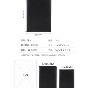 • 商品名称:得力3161高级记事本-16k-112张(黑)