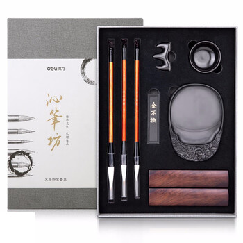 得力(deli)文房四宝套装/笔墨纸砚套装(毛笔/墨锭/砚/笔搁/水碗/镇尺) 米黄色 74289(定制)
