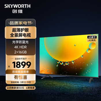 创维电视65A3 65英寸 4K超高清护眼防蓝光语音平板电视机 2+16G教育超薄全面屏 一键投屏 以旧换新