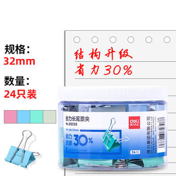 得力(deli)24只32mm省力彩色长尾夹票夹 3#中号金属燕尾夹票据文件夹子 办公用品 24只/筒 8553S